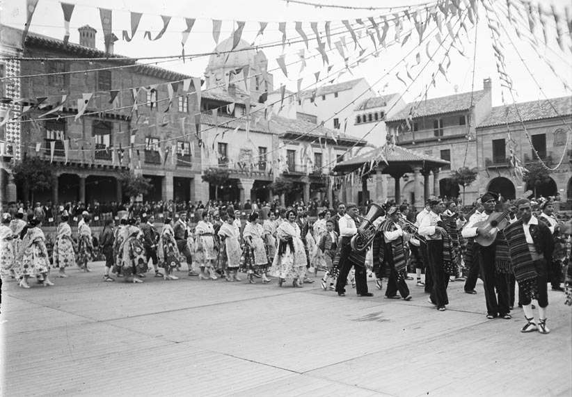 Una banda de músics i un grup de dansa, amb vestits tradicionals, desfilen en un dels actes de la Setmana Valenciana celebrada amb motiu de l'Exposició Internacional de Barcelona al Poble Espanyol.
