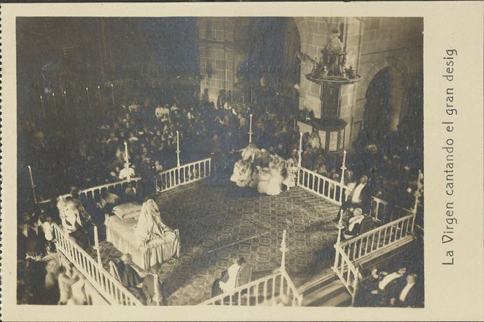 Allò que anomenem Misteri d'Elx és un drama litúrgic, és a dir, una representació teatral que té lloc dins dels temples amb una finalitat pedagògica. Explica la mort, assumpció i coronació de la Mare de Déu. Fruit de les interpretacions dels documents eclesiàstics ans esmentada, el paper de Mare de Déu és interpretat per un xiquet encara hui en dia. En la imatge, de principis de segle XX, s'aprecia un moment de cant d'aquesta en la representació. Cal afegir, però, que el paper de les dones fou rellevant en la conservació i manteniment de diferents elements de la Festa.