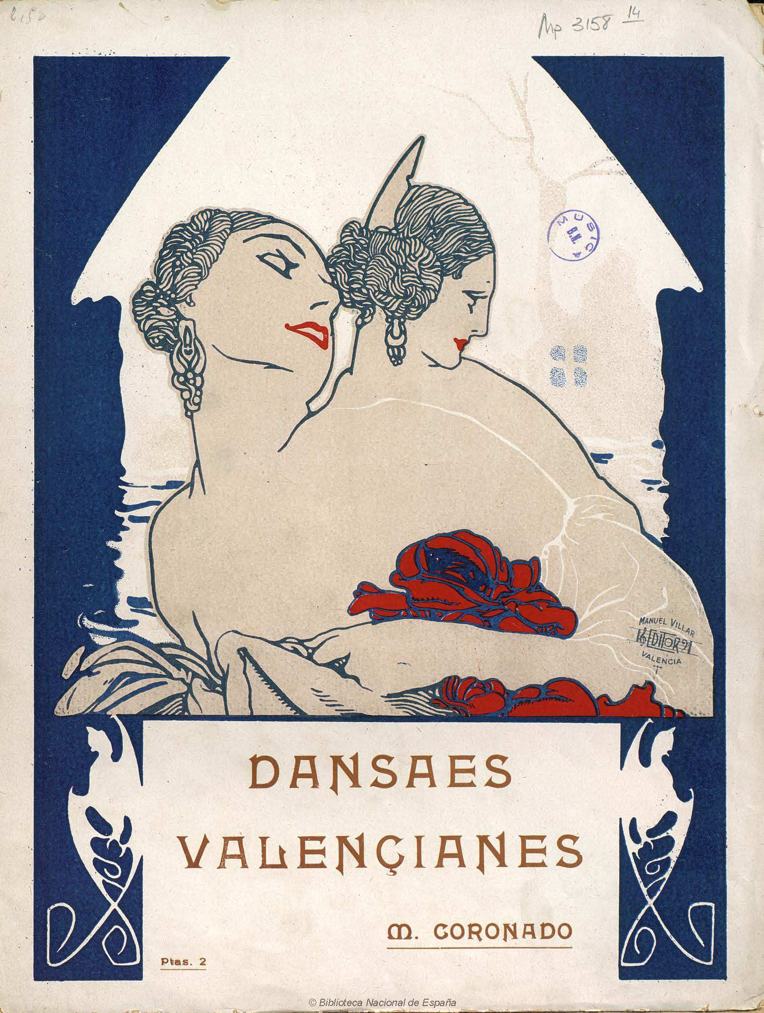 Portada d'estil modernista de la partitura 'Dansaes valencianes' del compositor Manuel Coronado. S'hi pot observar una dona amb l'adreç del vestit tradicional faller.